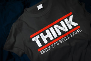 The phrase "Think While It's Still Legal" is a call to action, urging people to exercise their freedom of thought and expression before those rights are taken away. It is a reminder that in an increasingly polarized and politically correct world, it is important to speak up and think critically.